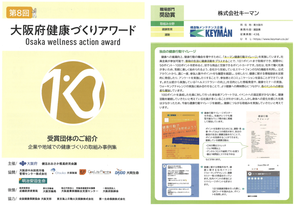 また、大阪府健康づくりアワード受賞団体の取り組み事例集にも、弊社の活動が紹介されました。