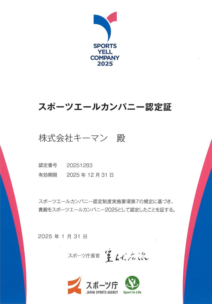 弊社は、文部科学省 スポーツ庁が推進する「スポーツエールカンパニー」制度において、社員の健康増進に向けた積極的な取組が評価され、「スポーツエールカンパニー2025」に認定されました。