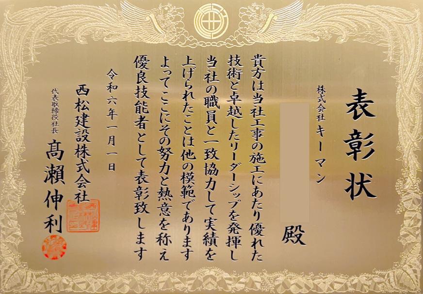西松建設株式会社 関東土木支社様より表彰状受賞