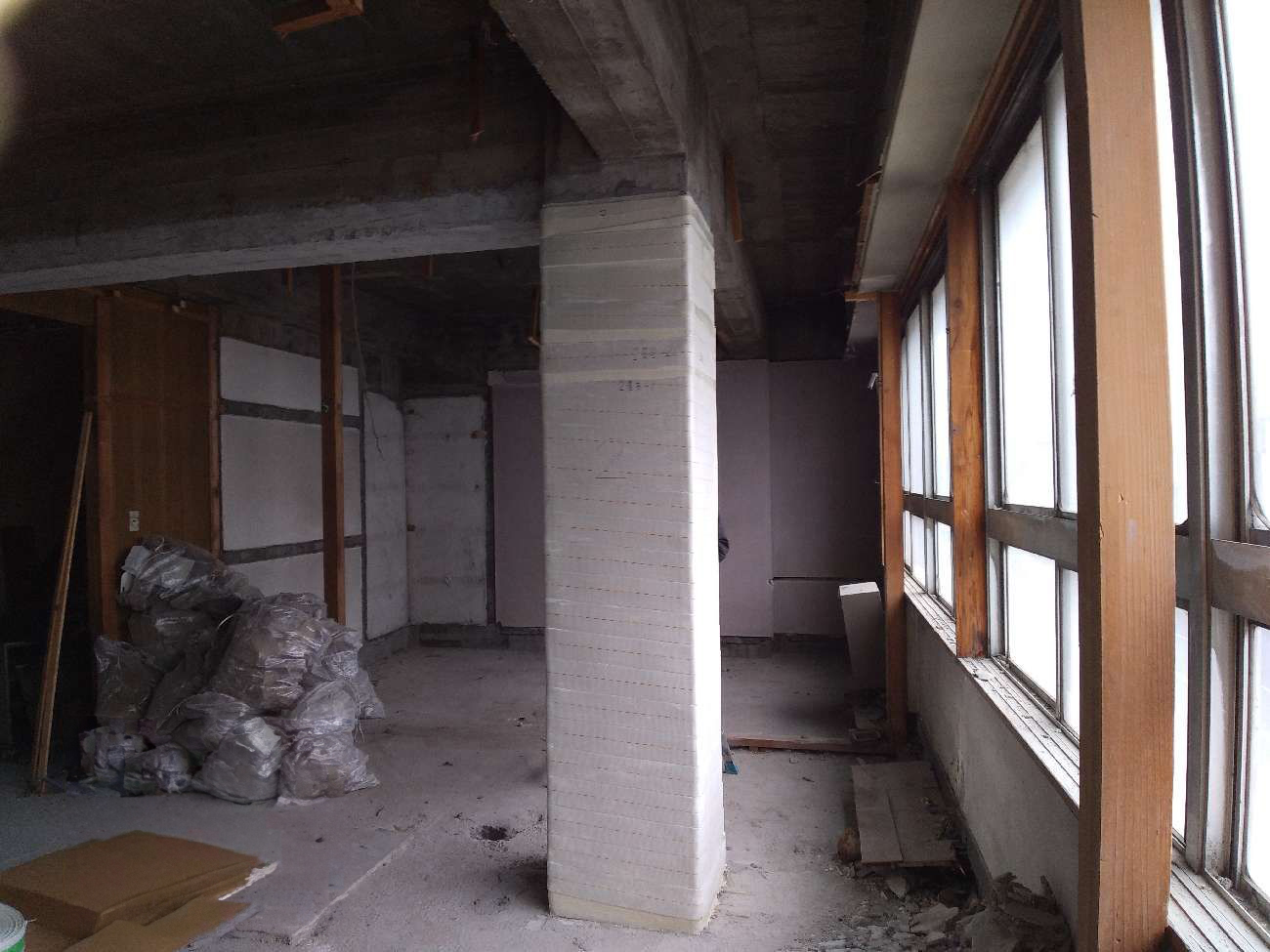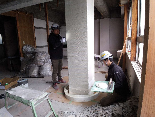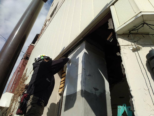 柱の近くや狭い作業スペースでも、ベルト材の巻き付け方法を変更することで、余分な解体作業を行うことなく進められるように工夫しました。