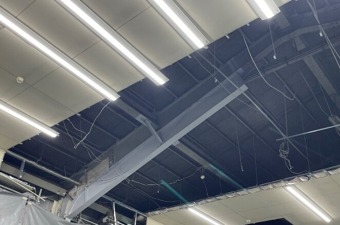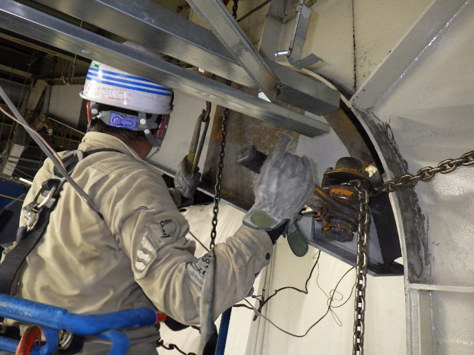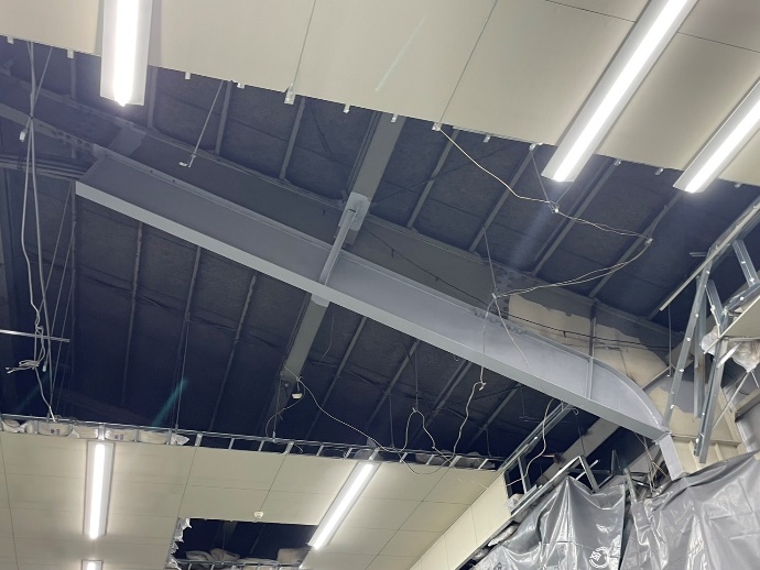 今回の工事では、屋根および壁面の鉄骨補強を実施しました。屋根では、既存の梁に新たな梁を接合し、さらに方杖を取り付けることで強度を向上させました。また、壁面にはクロスのブレースを柱間に取り付け、しっかりと補強を行いました。