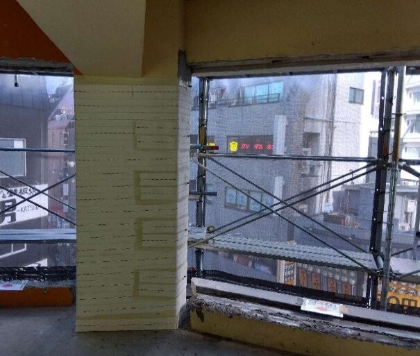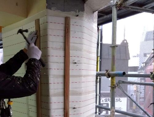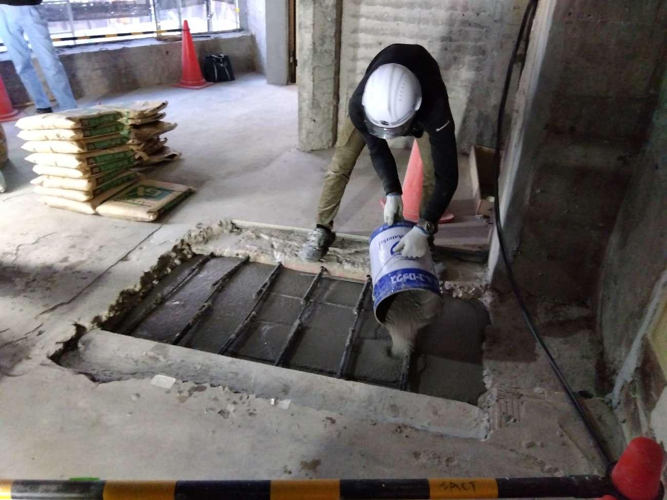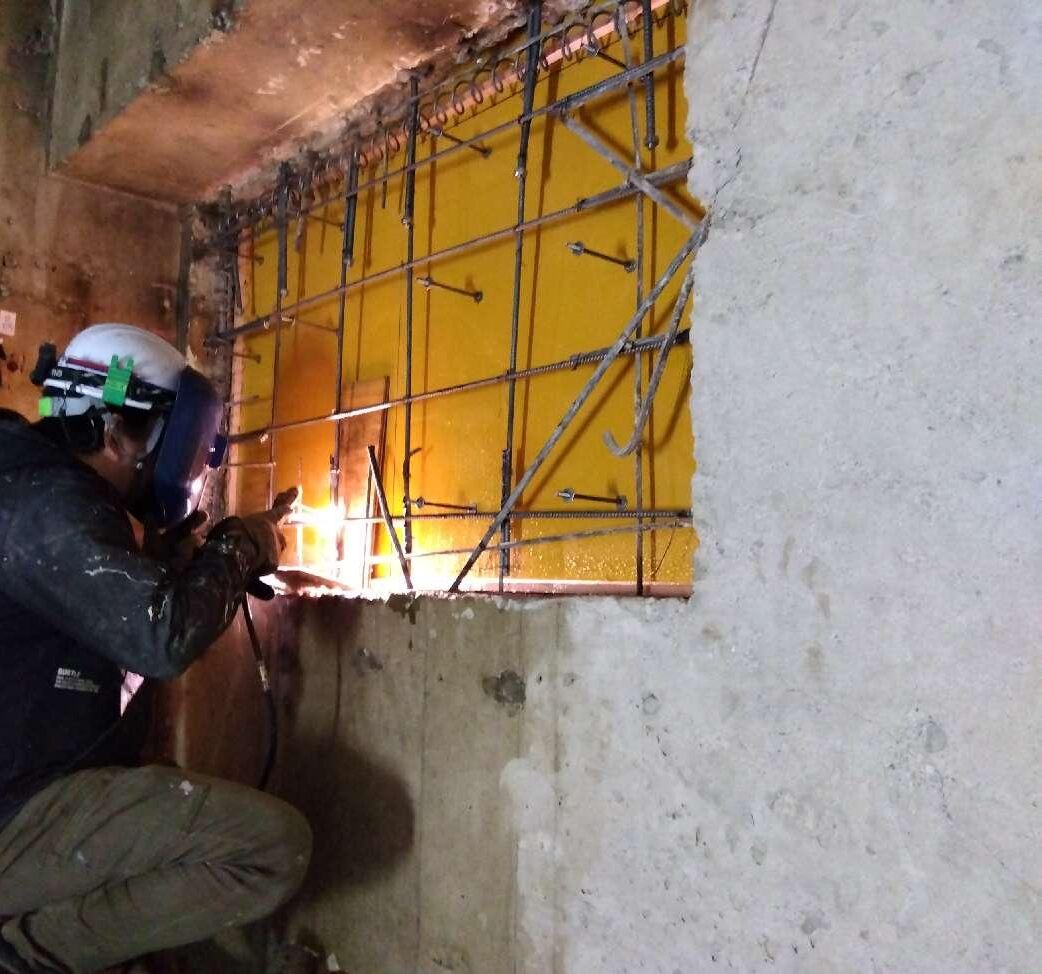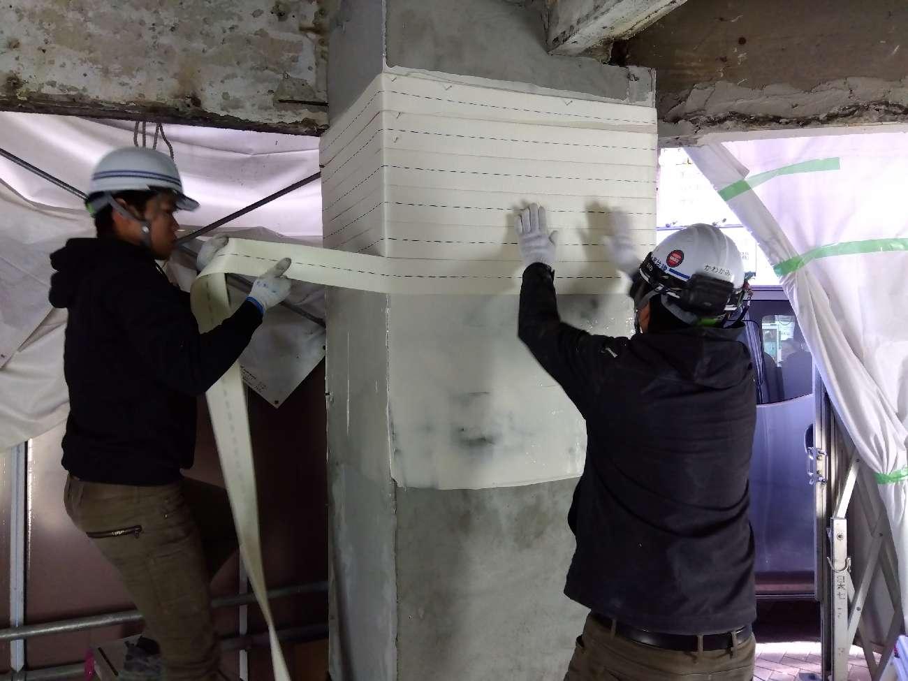 SRF工法、開口閉塞、鉄骨梁補強工事を行いました。補強材を柱に巻き付けたり、壁に短冊状に貼り付けるSRF工法では、補強対象物に突起物や窪みがないことが求められるため、解体作業や支障物の移設にも十分配慮し、現場を確認しながら調整を行いました。開口閉塞工事では、既存躯体の状況を確認しつつ施工を進め、想定外の事態にも設計者に報告しながら問題を解決しました。鉄骨補強工事では、搬入から荷上げ、取付けに至るまで現場状況を確認し、特に狭い場所であと施工アンカーによる固定が必要だったため、設計者と綿密に打ち合わせを行い、部材形状を変更するなど事前準備に時間をかけ確実に対応しました。施工方法の変更が発生する場面もありましたが、無事故で工期内に完工することができました。