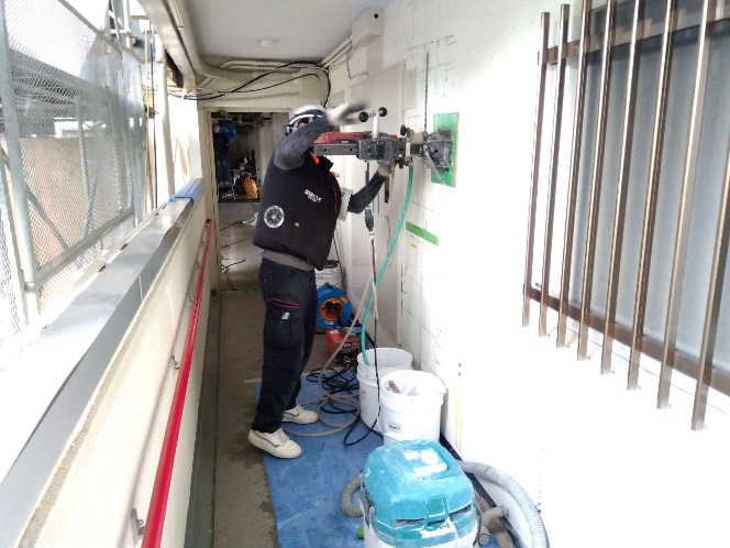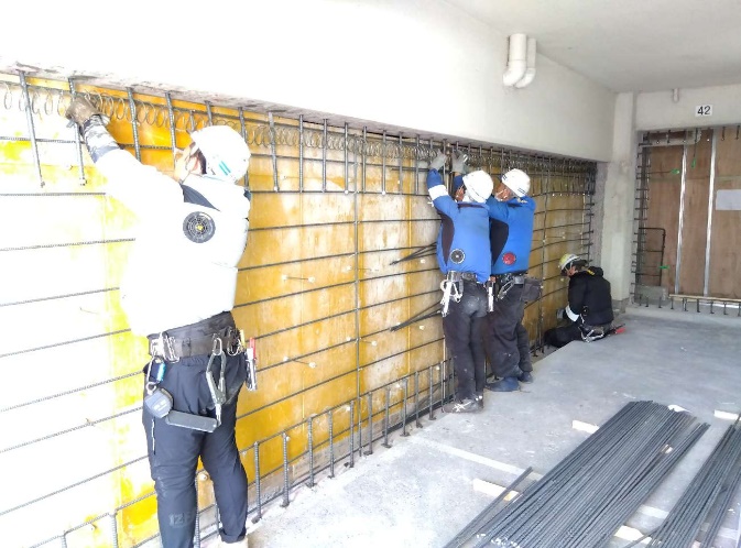 1970年代竣工、延べ約2,700㎡の旧耐震5階建てマンションにて、耐震改修工事を実施。1階駐車場の耐震補強に加え、各階の構造スリット新設およびEXP.J交換に伴うスリット材充填工事を行いました。居住者が生活する中での共用部施工のため、第三者災害防止に最大限配慮。着工後には地中梁の高さが図面と異なることが判明しましたが、速やかな実測・報告により設計監理者と連携して対応しました。補助金対象工事として、役所への報告・検査も3回行い、設計変更を含めて交付は問題なく進行。短期間の工事ながら、施主のご理解・ご協力のもと無事故・無災害で竣工し、ご評価として慰労会も設けていただきました。