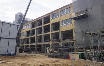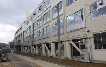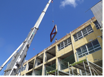 本工事は、デザインフィットの鉄骨建方を現場仮囲い外の体育館前で行いました。 児童・職員が在学している中での作業になり、搬入計画・区画等細心の注意を払いながらの作業となりました。