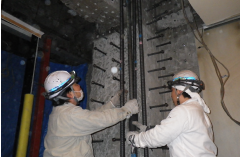 事務所ビルの耐震補強工事をハイパー工法で施工しました。 ハイパー工法は柱の補強において、鋼板に重ね継手を施し、その外側から連続繊維シートを用いて巻きつけ、柱と鋼板の間にグラウトモルタルを充填することによって柱と鋼板の一体化を図る工法です。 1Fは喫茶店で2Fから7Fまでが事務所となっており、平日は事務所 が営業をしているため土日が中心の作業となりました。店舗は改修期間が短かったため昼夜で施工を行い、ビルの皆さまの協力のおかげで無事に完了することができました。