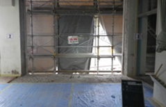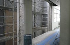今回の工事では、京都府立H高等学校校舎の耐震補強を行いました。 学校の校舎耐震補強は、一般的には夏休み等の長期休暇を利用して行いますが、本工事は、 仮校舎としてプレハブを設置し生徒の方は完全に校舎を使用しない状態での工事でした。 工事内容は、耐震壁増設工事で、施工前の写真のように既設に壁を解体、撤去し、施工後のように新規に耐震壁を設置する工事でした。 校舎は完全に生徒の方は使用しませんが、学校自体は授業を行っていた為、騒音、粉じん等に配慮し、特に外壁面では、生徒の方々に迷惑が掛からないよう、周辺に飛散することが無いよう作業員に周知徹底して作業を行いました。 工程としても、仮校舎からの引っ越しの準備の期限が決められており、工期に余裕はありませんでしたが、 安全管理、工程管理、品質管理といった必要事項を現場内にて密に行い、無事無事故無災害で完工することが出来ました。